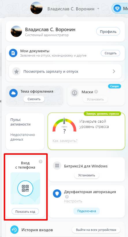 6.2. Вход в Битрикс24 с активной сессией в браузере и QR кодом.