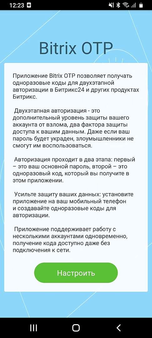 6. Открываем на мобильном телефоне Битрикс24 ОТП. Нажимаем кнопку "Настроить"