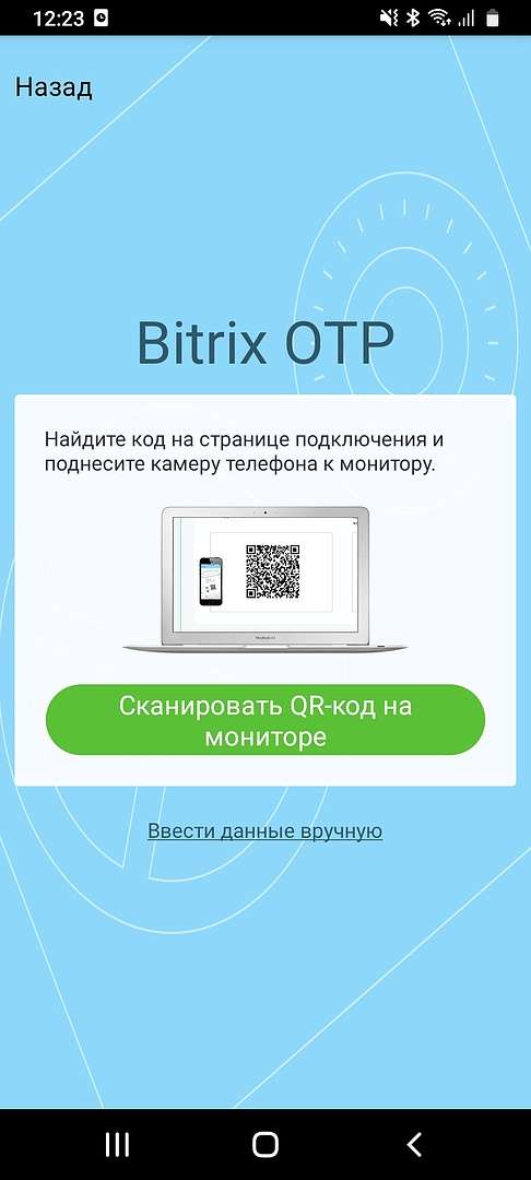7. Если на телефоне работает основная камера, выбираем "Сканировать QR-код на мониторе". В противном случае, выбираем "Ввести данные вручную" и вводим данные слева от QR-кода