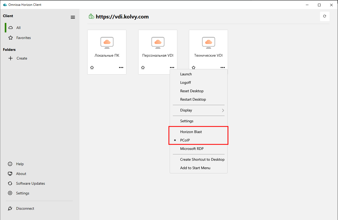6.1) В случае если вы работаете с токенами, необходимо сменить протокол, выберите "Horizon Blast" или "PCoIP", выбор всегда можно изменить, выберите один и другой и проверьте какой будет более плавным на вашем ПК и соединении.